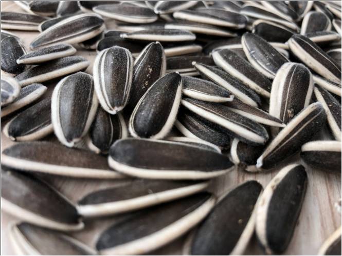 食葵,晚熟品種,平均生育期117天。株高1.8至2.2米,平均盤徑25厘米,花盤傾斜度4~5級,結(jié)實(shí)率78%左右,葉色深綠,植株健壯,開花期長,花盤平整,籽粒黑底白邊,平均粒長2.55厘米,寬1.1厘米。