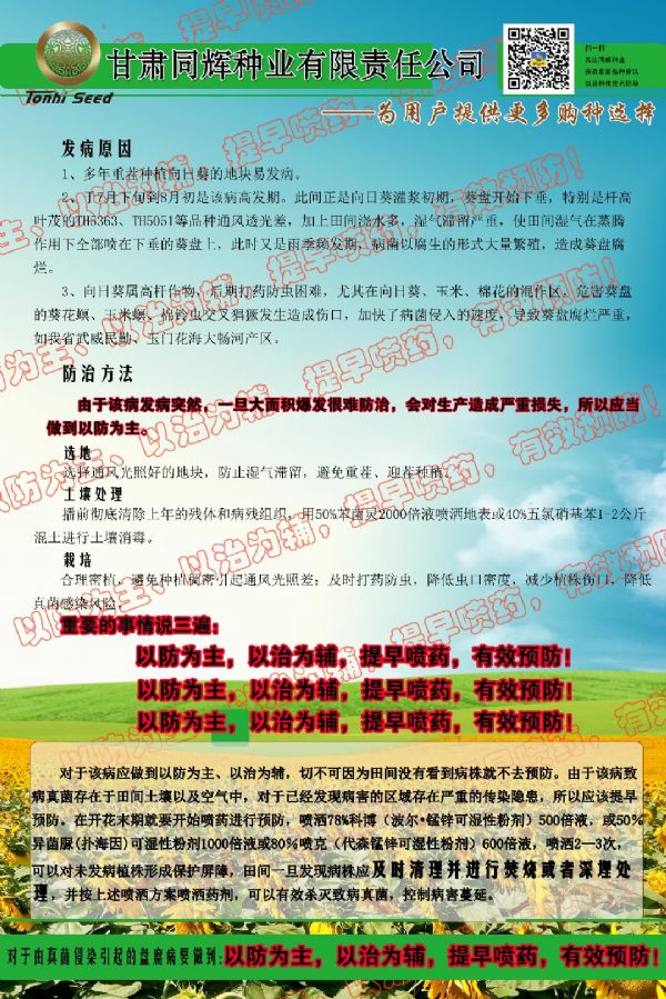 面對(duì)2015年向日葵盤腐病嚴(yán)重發(fā)病的情況,公司制定了向日葵盤腐病防治技術(shù)指南(廣告版),請(qǐng)點(diǎn)擊圖片放大閱讀,或者下載圖片閱讀或打印。