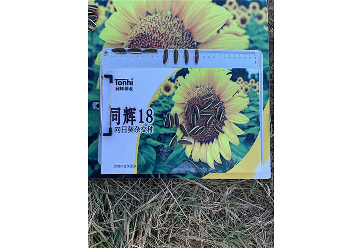食葵,中早熟品種,平均生育期101天。株高160厘米左右,平均盤徑24厘米,花盤傾斜度4級,結(jié)實率62%,葉色中綠,花盤平整,籽;业装走叄骄iL2.45厘米,寬0.95厘米。